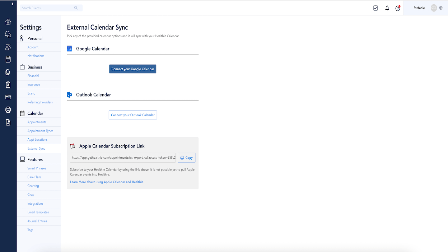 Healthie's Calendar can be integrated with Apple Calendar to streamline your operations, prevent appointments from being booked when you are unavailable, and make it easy to manage and align your schedule in one place. Integrating your personal and professional calendars prevents double booking while benefiting from Healthie calendar features, such as automated confirmation and reminder emails/SMS (text) messages.