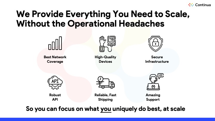 Continua provides an enterprise-grade device operations portal, developer friendly API and support. In partnership with Healthie, Continua provides everything you need to launch your own Remote Patient Monitoring program at any scale ranging from a single medical practice to tens of thousands of patients.