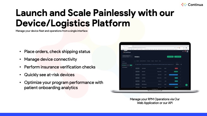 Continua provides an enterprise-grade device operations portal, developer friendly API and support. In partnership with Healthie, Continua provides everything you need to launch your own Remote Patient Monitoring program at any scale ranging from a single medical practice to tens of thousands of patients.