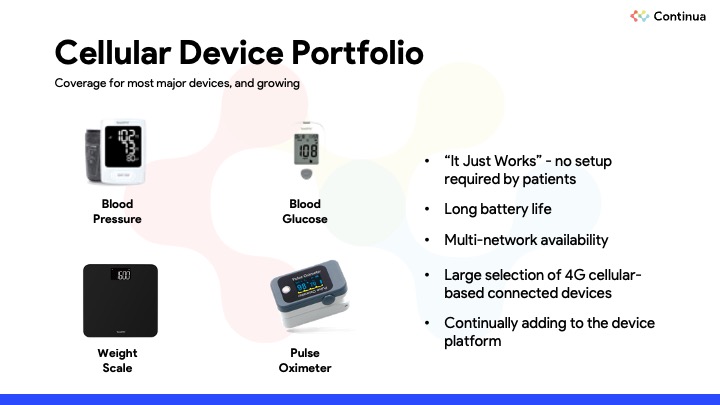 Virtually all of the leading remote patient monitoring and connected health vendors use cellular-based devices due to the ease of use and superior patient and provider experience. Some companies include Omada Health, Livongo, HealthSnap, Cadence, Optimize Health, Rimidi, Accuhealth and more.