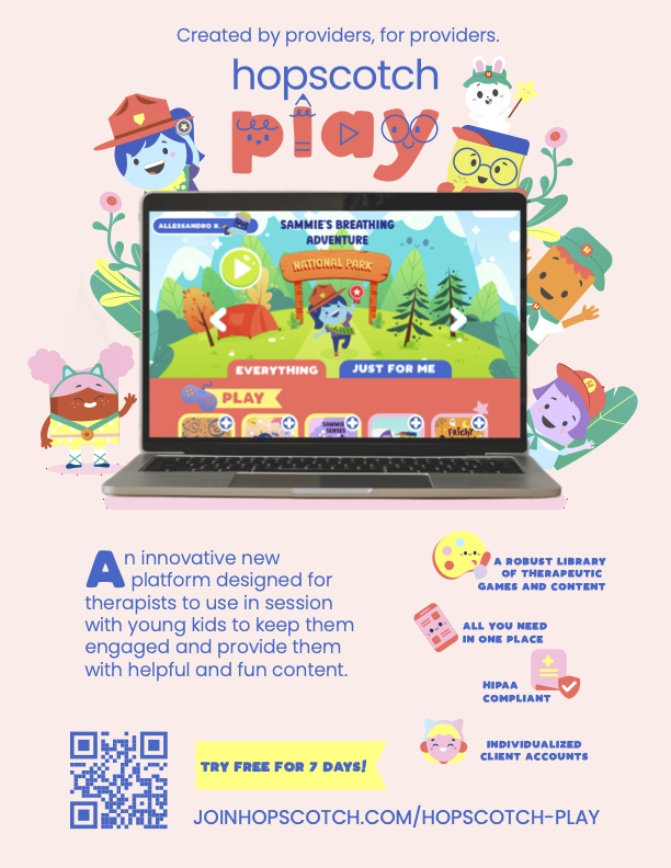 Hopscotch Play is a child therapy oriented digital platform to help providers better engage their young clients (in person and virtually), through a robust library of clinician created games, interactive stories, mindfulness activities and more. With Hopscotch Play, planning for and conducting therapy sessions with children is seamless and fun through an intuitive platform filled with interactive and engaging content. Â