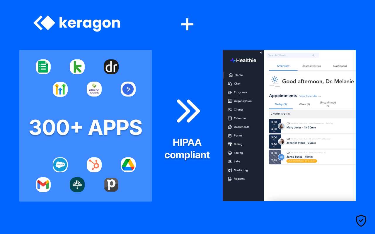 Keragon connects Healthie with your other tools to automate intake, scheduling, billing, and follow-ups. It removes manual steps, keeps data aligned, and helps your team deliver smoother patient experiences.