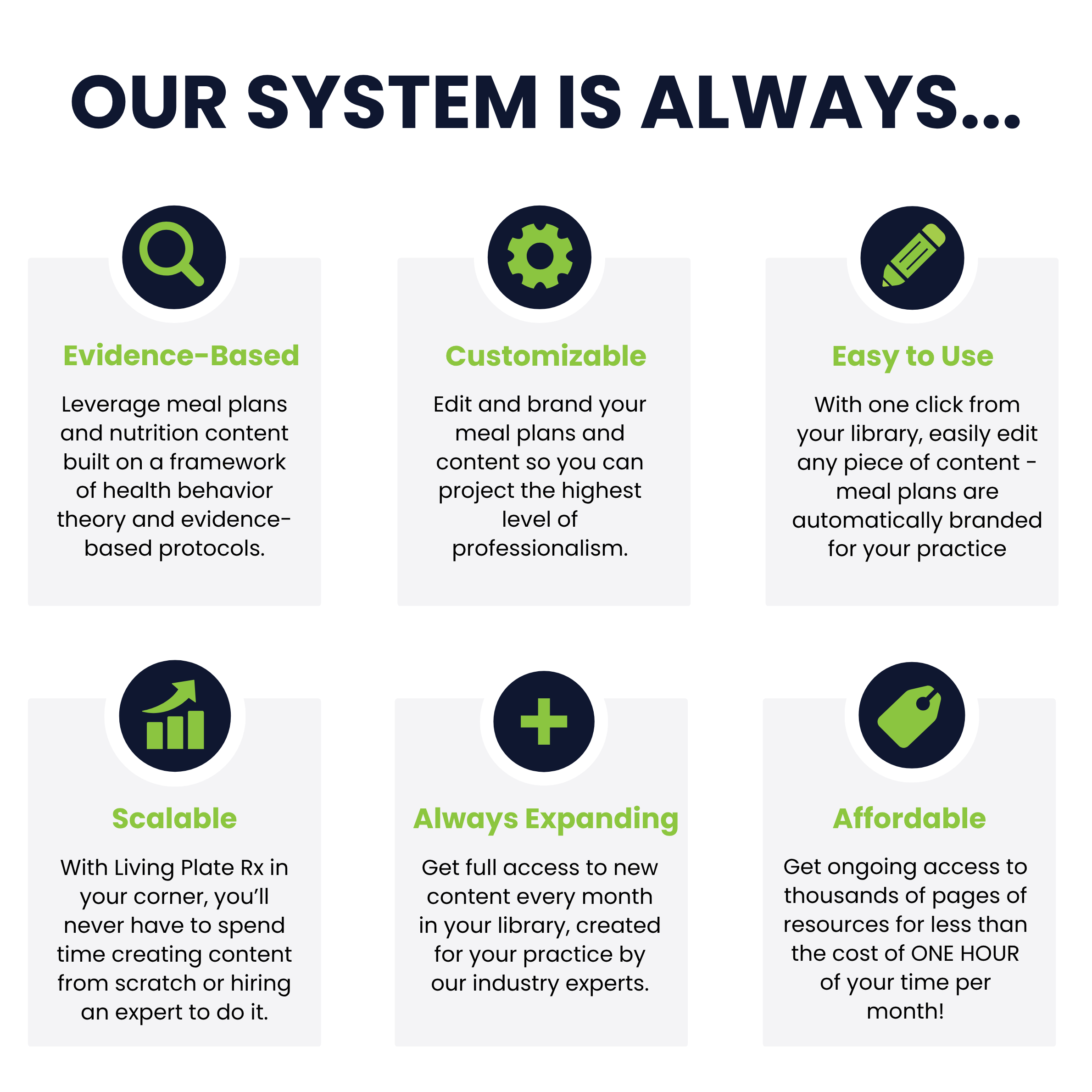 Living Plate Rx is a leading evidence-based nutrition content and meal-planning platform that practitioners use to save time from creating content from scratch, add value to their services, and improve their clients' nutrition-related health behaviors. Join more than 4,000 practitioners already using our resources.
