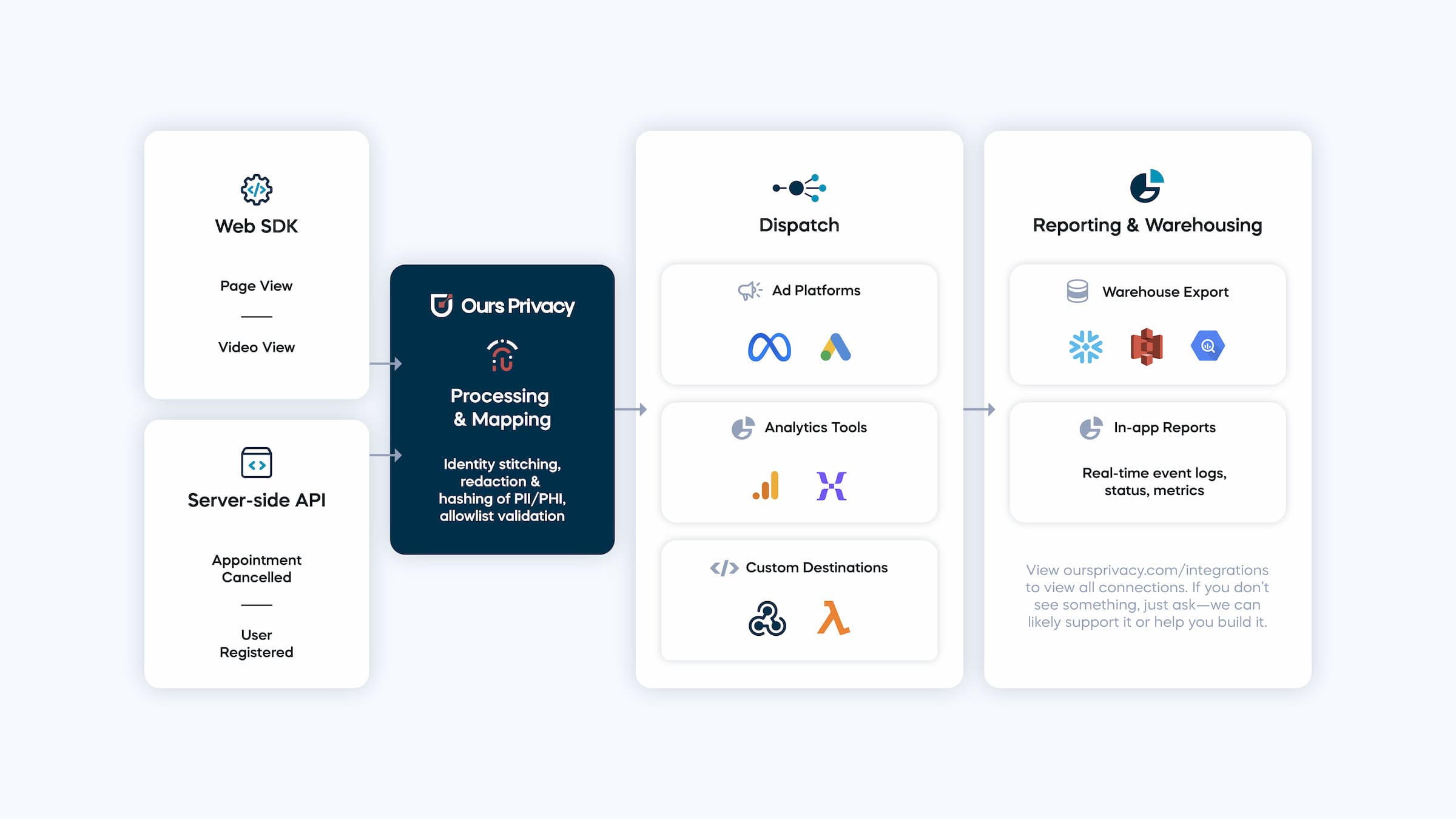 All data from Healthie flows through Ours Privacy’s secure, HIPAA-compliant infrastructure. Personal health information (PHI) is filtered or anonymized so that no sensitive patient details are ever shared with third-party ad platforms.