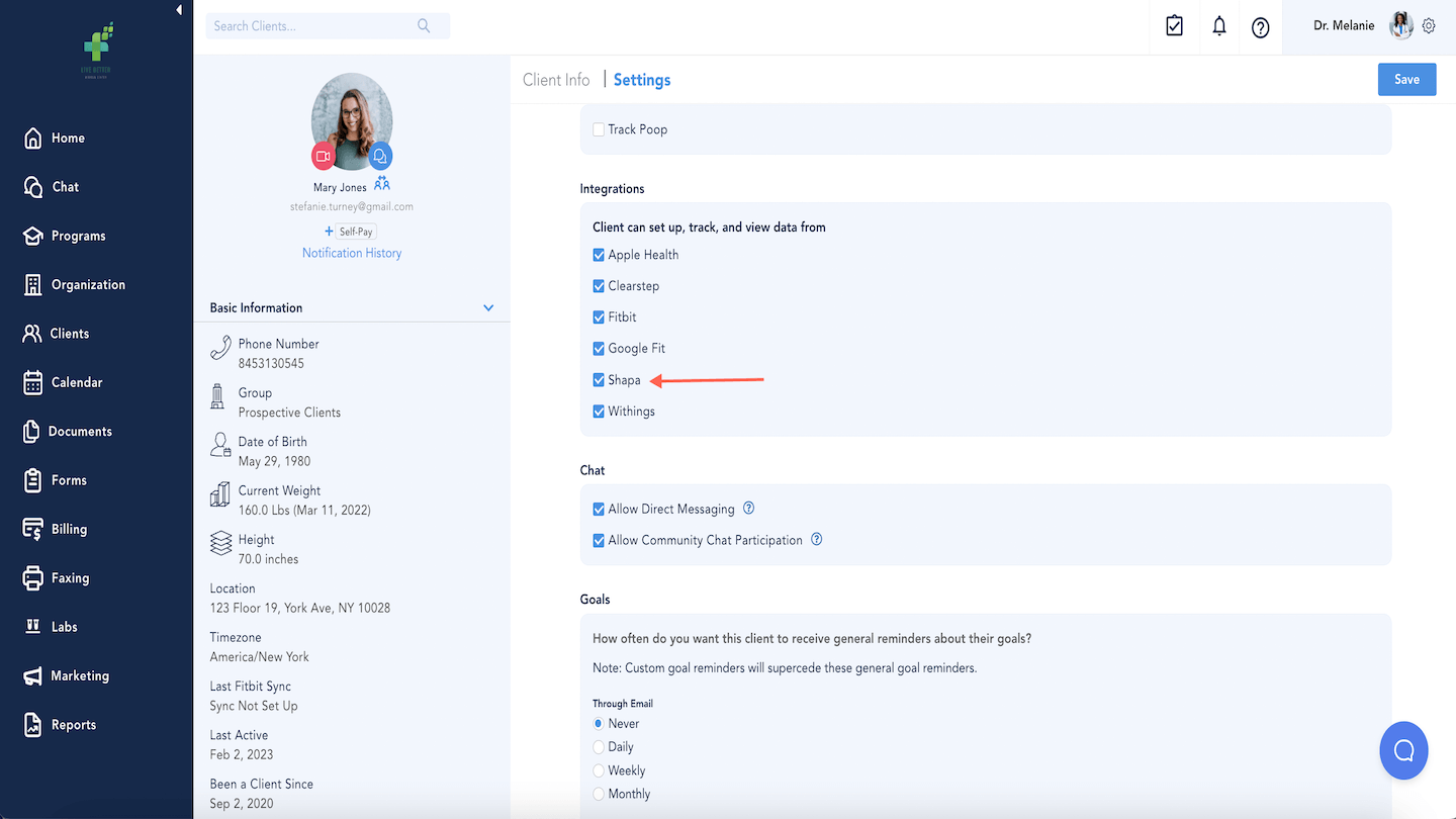 Healthie integrates with Shapa products to enable providers to seamlessly view client records for key health metrics, directly within Healthie. This enables providers and organization administrators to view data inputs from clients within the Healthie portal, and download reports with aggregated information on a universal, per group, or per client basis.