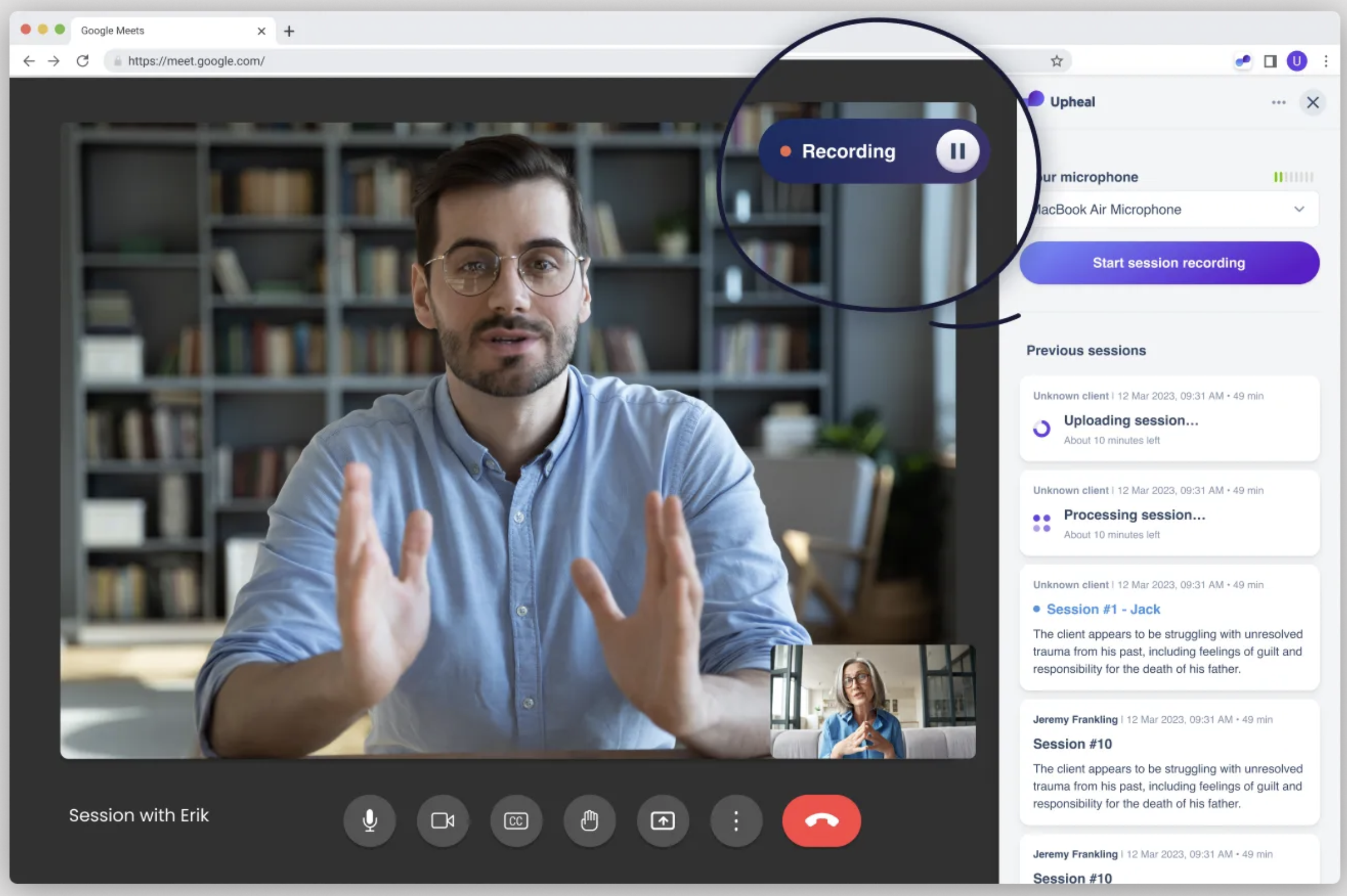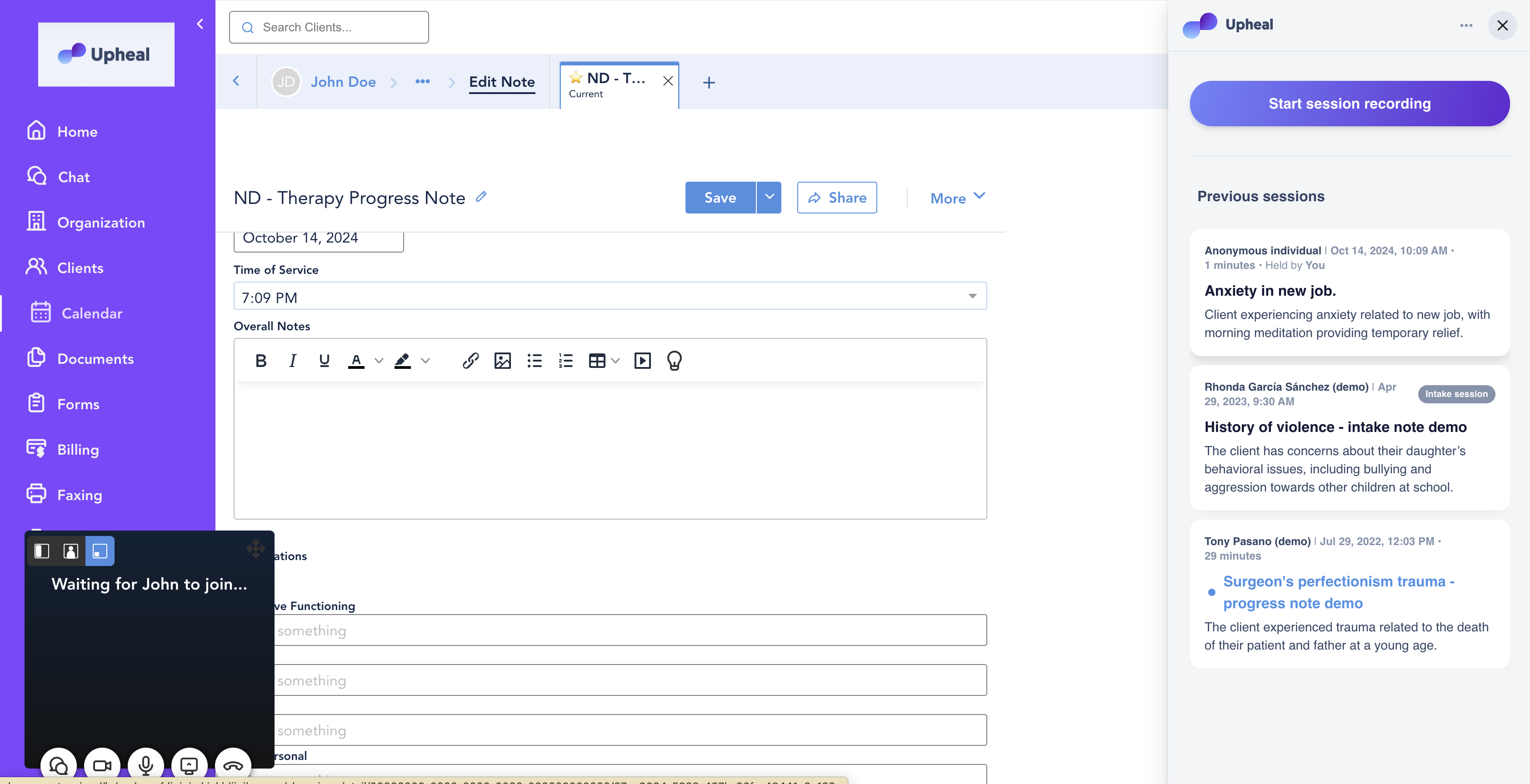 Upheal provides its own telehealth platform, or you can continue to use your existing telehealth platform for video calls.