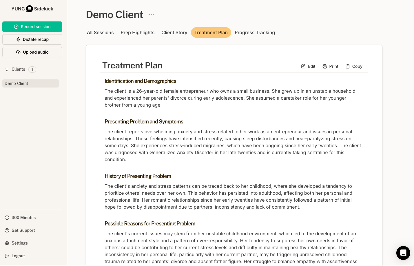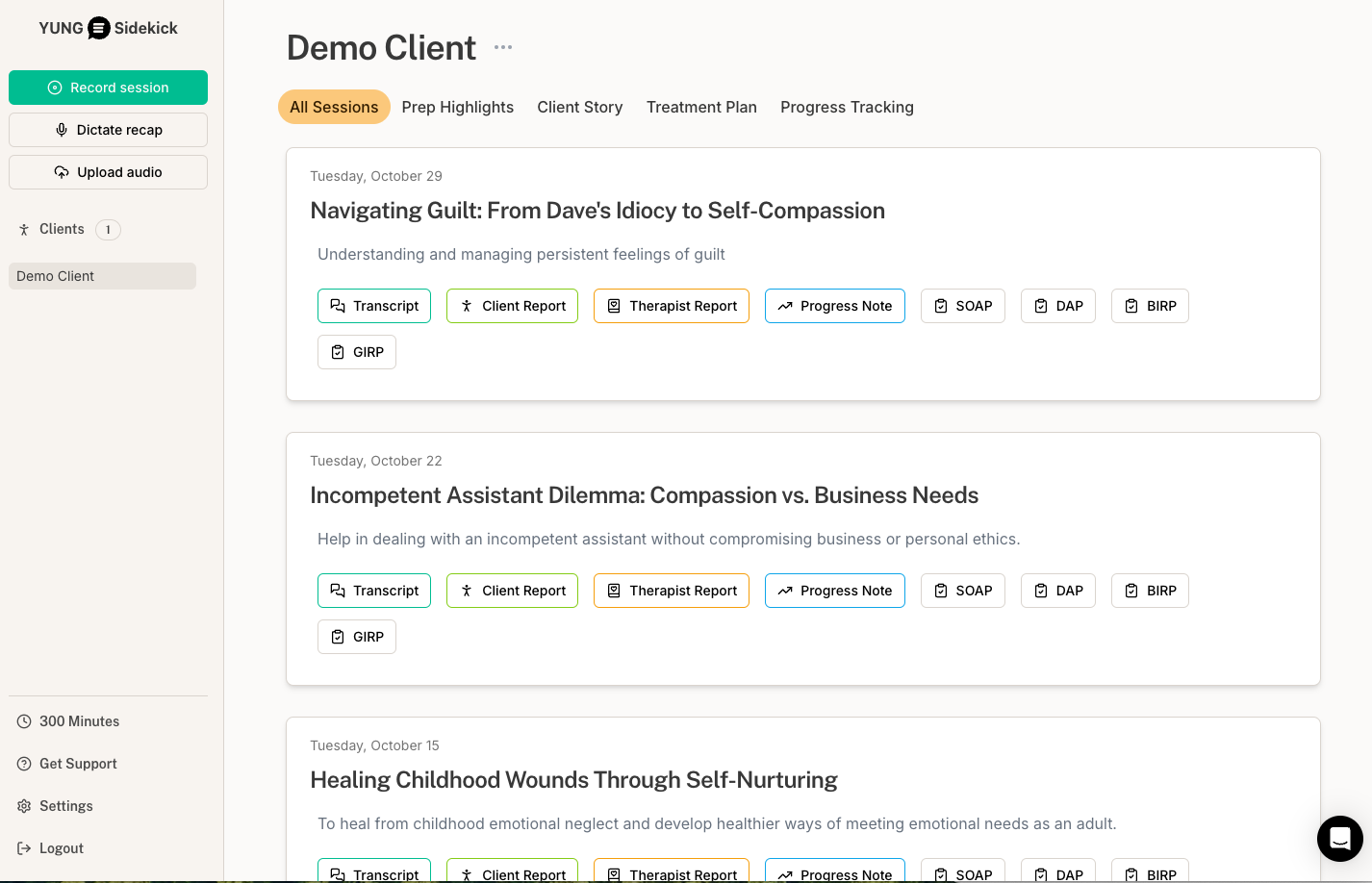 YUNG Sidekick captures your session and automatically generates a transcript, and our Al creates progress notes and insightful therapy reports with analytics. For clients with multiple sessions, it compiles comprehensive 'meta' reports, offering detailed client histories and psychological profiles.