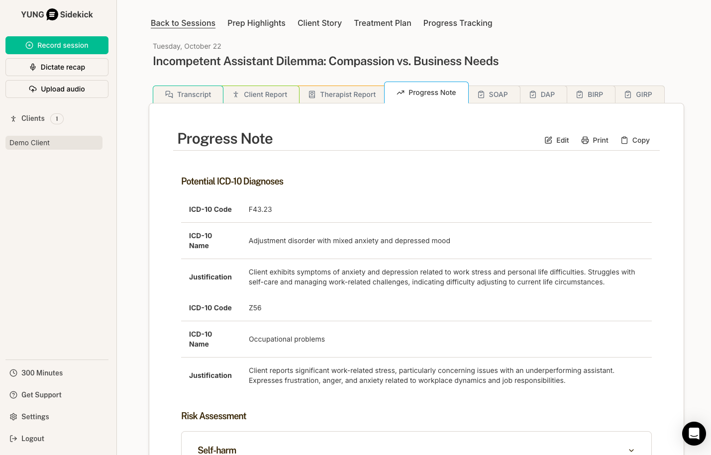 YUNG Sidekick is a groundbreaking AI-powered tool that transforms how therapists document sessions. Built for seamless integration, YUNG Sidekick helps Healthie users create detailed, accurate SOAP notes and treatment plans with ICD-10 codes with just a few clicks. Our platform cuts documentation time by up to 90%, empowering you to take on more clients, reduce stress, and enhance the quality of your care. Designed to capture the nuances of each session, YUNG Sidekick offers a streamlined approach to clinical documentation, freeing you up to focus more on your clients and less on administrative tasks.